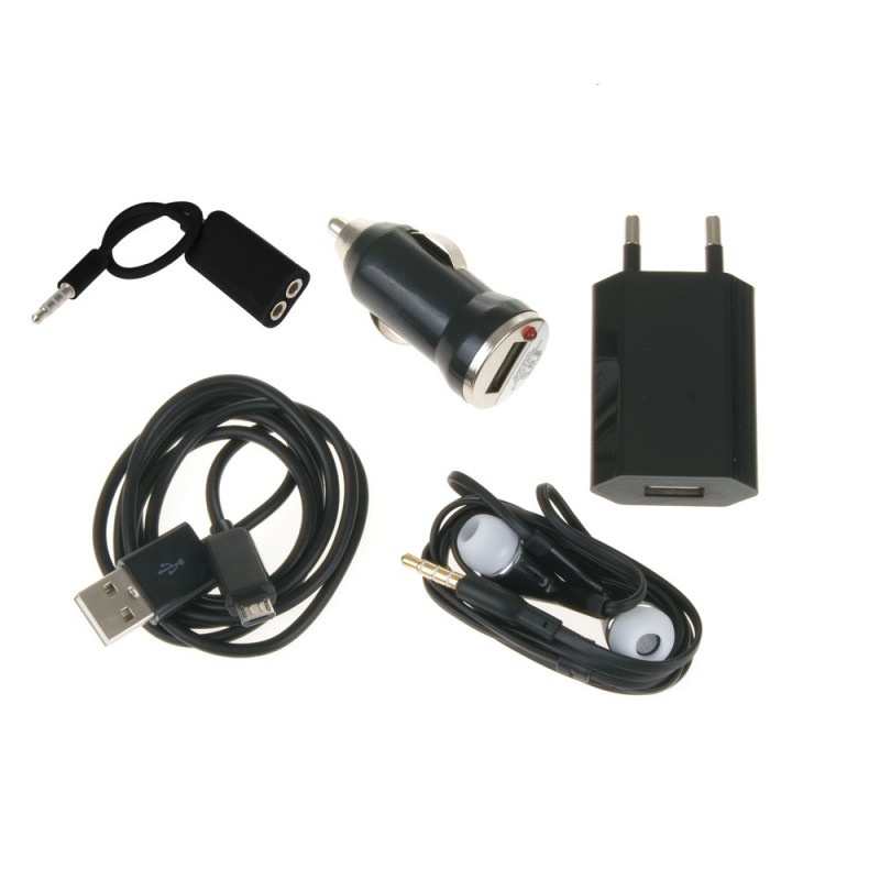 KIT 5 EN 1. CONTIENE CARGADOR PARA EL COCHE. CABLE DE DATOS. AURICULARES CON MICRÓFONO. CARGADOR DE PARED: ENTRADA 5V SALIDA : 5V. DOBLE CABLE MINIJACK 3,5 mm. PVC Metal