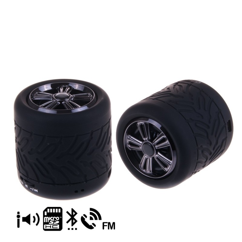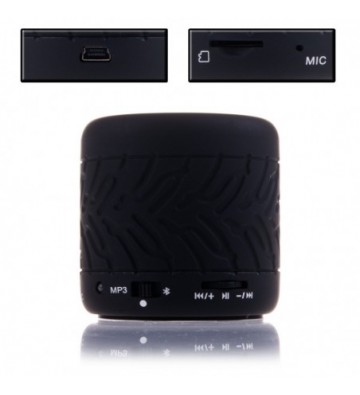 ALTAVOZ BLUETOOTH EN FORMA DE NEUMÁTICO CON LECTOR DE TARJETAS MICRO SD Y MANOS LIBRES. BLUETOOTH 2.1 SALIDA ALTAVOZ 3W (4 OHMIOS) RESPUESTA DE AUDIO 100Hz-18KHz ALIMENTACION 5V BATERIA DE 600mHa DE HASTA 6 HORAS DE DURACION Potencia: 3W. Alcance: hasta 10m sin obstáculos. PVC Aleación_de_Metal
