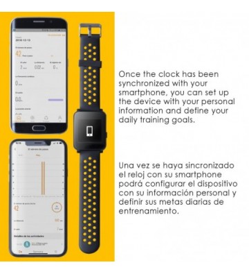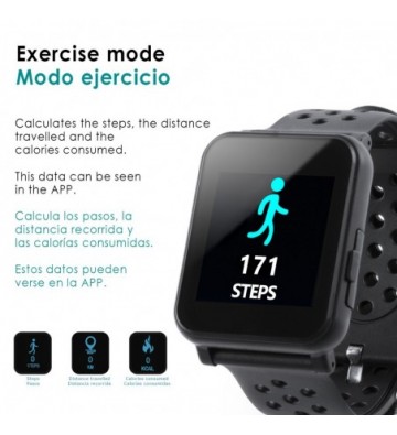 • Podómetro con contador de pasos, distancia recorrida y estimación de calorías quemadas.