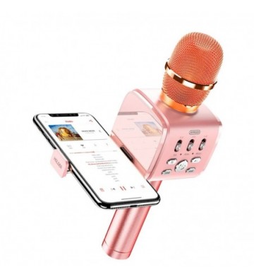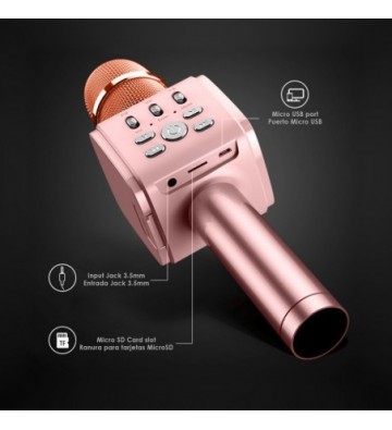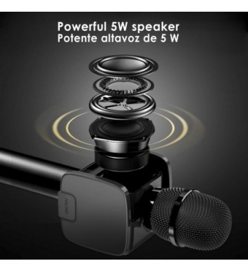 Micrófono para Karaoke con altavoz y soporte incorporado. • Haz sonar la música desde tu smartphone y canta a la vez. Gracias al soporte incorporado podrás leer las letras de tus canciones preferidas de manera cómoda. • Sonido potente de alta calidad, con reducción de ruido. Escucharás la voz de manera nítida y con matices. • Conexión bluetooth 4.2 libre de cables, de bajo consumo. • Control de volumen de la música independiente al de la voz. • Efecto reverberación (eco / reverb) ajustable. • Soporte para smartphone incorporado: para dispositivos de hasta 8.3cm de ancho. Plegable, queda totalmente oculto cuando no se utiliza. • Sencillo de utilizar: podrán usarlo desde los más pequeños hasta los mayores de la casa. • Batería recargable. • Entrada minijack y lector de tarjetas micro SD. Bluetooth: 4.2 Batería: recargable, 1500mAh Tiempo de uso: a volumen medio, hasta 5 horas. Compatible con formatos MP3 y WAV. Protocolo inalámbrico: A2DP / AVRCP / HSP Almacenamiento: micro SD de hasta 32GB. Respuesta en frecuencia: 100Hz – 10KHz. Altavoz: 5W Distancia bluetooth: hasta 8 – 10 metros Frecuencia inalámbrica 2.4GHz Entrada: 0.5 – 1A Carga: 5V PVC Aleación_de_Metal