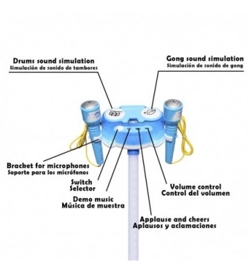 Karaoke infantil con 2 micros, luces y efectos. • Haz sonar la música desde tu smartphone y canta a la vez. Cable de conexión minijack (Jack 3.5mm). • Mesa de control con soporte para smartphone y botones de efectos: bombos, platillos, aplausos y música demo. • Stand regulable en altura desde 59 hasta 89 cm, con base de 3 patas estable. • Luces led ambientales. • Funciona con 3 pilas AA 1.5V no recargables (no incluidas). Baterías: 3x AA 1,5V PVC Aleación_de_Metal