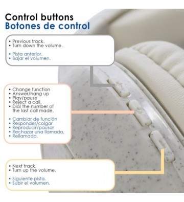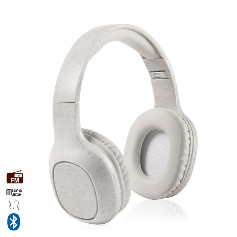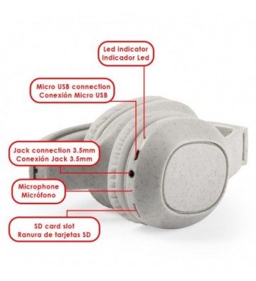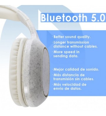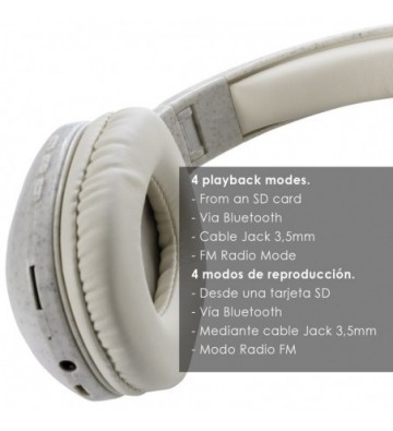 Auriculares de diadema en línea nature con conexión Bluetooth 5.0. Carcasa en caña de trigo y almohadillas ergonómicas de polipiel. Panel de control integrado en el auricular, Ranura para tarjeta Micro SD, Función manos libres y radio FM. Cable de línea jack 3.5mm. Recargables mediante cable micro USB (incluido). • Versión Bluetooth 5.0 • Salida auriculares: 10mW • Distancia de funcionamiento: Hasta 10 metros • Frecuencia: 100Hz-20KHz • SNR: 85dB • Impedancia: 32 Ohms • THD: 1% • Batería de Litio 400mAh, 3.7V • Tiempo en funcionamiento: hasta 2.5h • FM Radio: 87 - 108MHz • Tarjeta Micro SD: Hasta 32GB • Formatos de audio admitidos: MP3/WMA/ASF Caña_de_trigo Aleación_de_Metal
