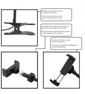 • Soporte para smartphone regulable, con rotación 360° para posicionar en horizontal y vertical. Rótula de bola con ajuste de inclinación. Permite teléfono de hasta 8,3cm de ancho.