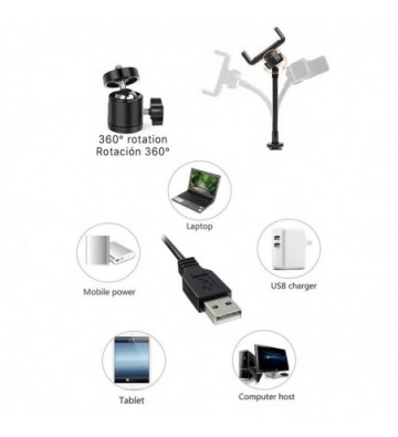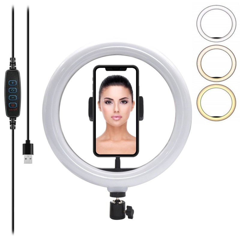 Anillo led estudio con soporte para smartphone. • 3 modos de luz: cálida, intermedia y fría. • 10 intensidades seleccionables. • Anillo de luz de 10 pulgadas / 25.4cm. • Mando integrado en el cable de alimentación USB. Permite el control total sobre la luz de manera sencilla. • Rótula con adaptador de trípode, permite un control total de rotación e inclinación sobre la luz. • Soporte para smartphone con rotación 360°, flexible. Para smartphones de hasta 9.2cm de anchura. • Rosca de paso universal para trípode. ABS Aleación_de_Metal