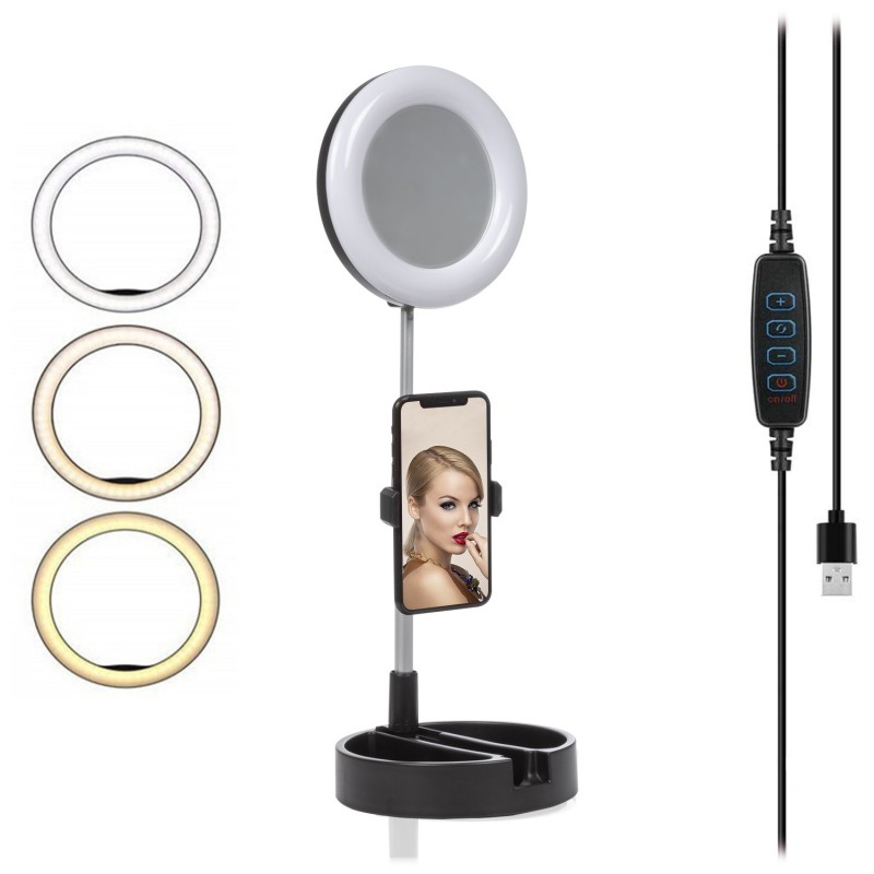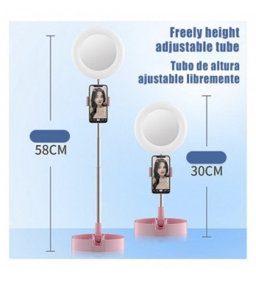 Anillo Luz LED estudio plegable extensible sobremesa con soporte smartphone. Espejo y caja para maquillaje