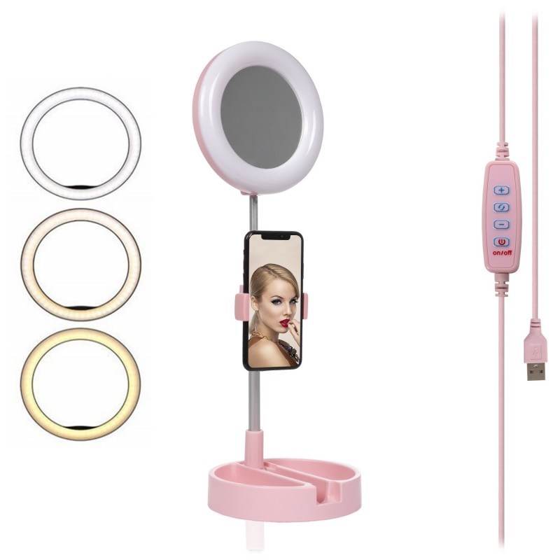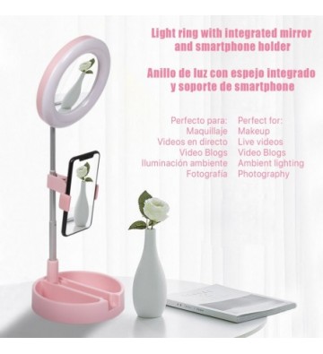 Anillo Luz LED estudio plegable extensible sobremesa con soporte smartphone. Espejo y caja para maquillaje • 3 modos de luz: cálida, intermedia y fría. • 10 intensidades seleccionables. • Anillo de luz de 6 pulgadas / 16cm. • Mando integrado en el cable de alimentación USB. Permite el control total sobre la luz de manera sencilla. • Inclinación con ángulo desde -90° hasta 90 °. • Soporte para smartphone con rotación 360°, sujeción tipo pinza. Para smartphones de hasta 7,6cm de anchura. • La base permite guardar objetos tipo maquillaje; sirve para guardar todos los elementos desmontables del producto de manera ordenada. • Totalmente plegable. Color de la luz: luz blanca, luz cálida, luz blanca cálida Equipo de luz: 10 Número de leds: 64. Temperatura de color: 3500-6000k Potencia de la lámpara: 6-12w Voltaje de la lámpara: 5V Diámetro: 6 pulgadas / 16cm ABS Aleación_de_Metal