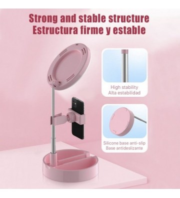 Anillo Luz LED estudio plegable extensible sobremesa con soporte smartphone. Espejo y caja para maquillaje