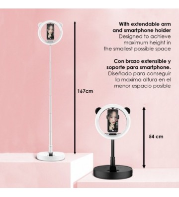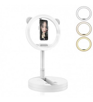 Anillo Luz LED estudio plegable extensible sobremesa con soporte smartphone. • 3 modos de luz: cálida, intermedia y fría. • 12 intensidades seleccionables. • Anillo de luz de 10,8 pulgadas / 27,5cm. • Botones de control integrados en el anillo de luz. Permiten el control total sobre la luz de manera sencilla. • Soporte para smartphone con rotación 360°, tubo flexible para facilitar su posicionamiento. Para smartphones de hasta 8,5 cm de anchura. • Totalmente plegable. • Orejitas tipo oso panda desmontables. Número de tramos de expansión: 7 Color de la luz: luz blanca, luz cálida, luz blanca cálida Equipo de luz: 10 Número de luces led: 128. Temperatura de color: 2700-6000k Potencia de la lámpara: 12-24w Voltaje de la lámpara: 5V Altura máxima extendido: 167cm. Longitud del cable: 200cm ABS Aleación_de_Metal