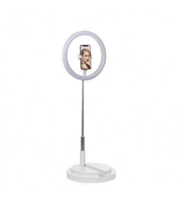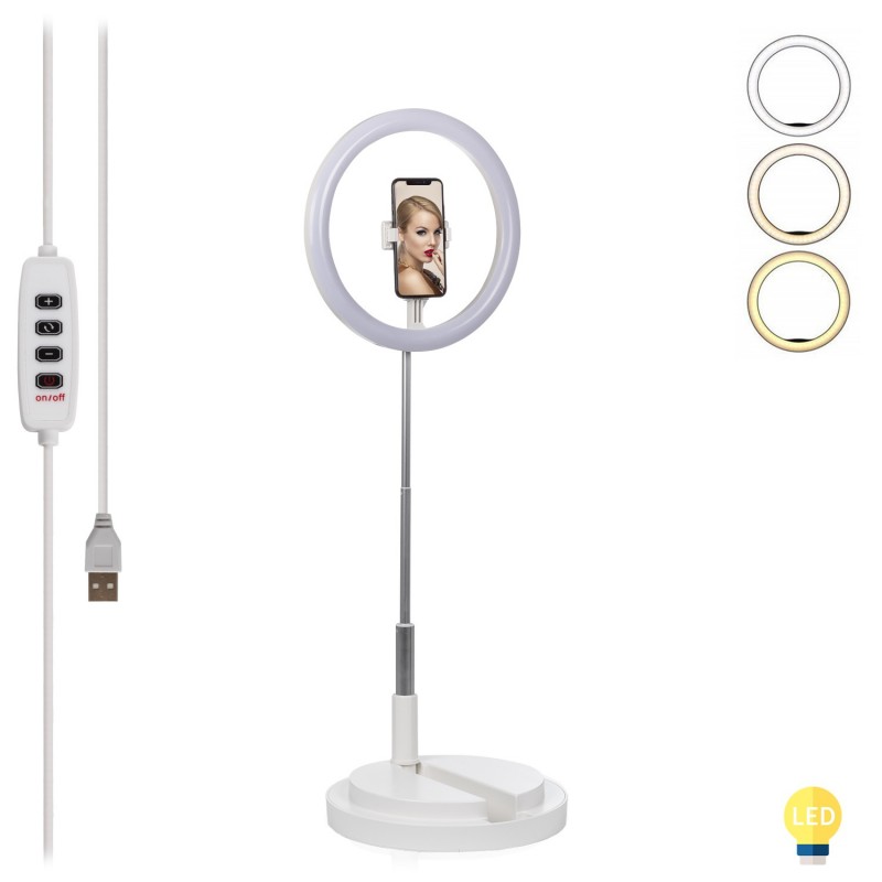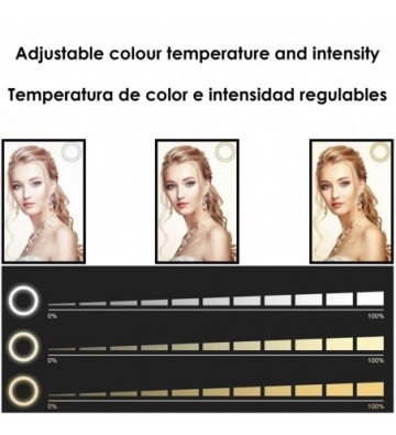 Anillo led estudio extensible con soporte Smartphone. • 3 modos de luz: cálida, intermedia y fría (3500 a 6000K). • 10 intensidades seleccionables. • Anillo de luz de gran tamaño: 11,4 pulgadas / 29cm • Soporte para smartphone con áreas de sujeción de goma, antideslizamiento; para smartphones de hasta 9,8 cm de anchura. Con rotación 360°. • Extensible desde 52cm hasta 171cm. • Mando integrado en el cable de alimentación USB. Permite el control total sobre la luz de manera sencilla. • Totalmente pleglable. Temperatura de color: 3500-6000k Voltaje de la lámpara: 5V Altura: 0.52m-1.71m Nº de LEDS: 160 Longitud del cable: 200cm. ABS Aleación_de_Metal