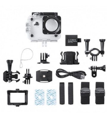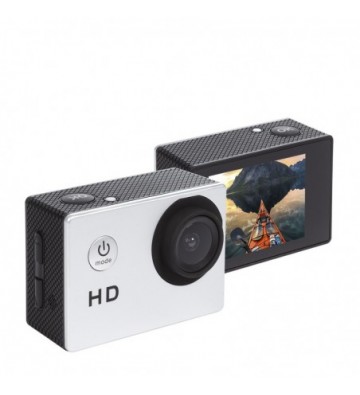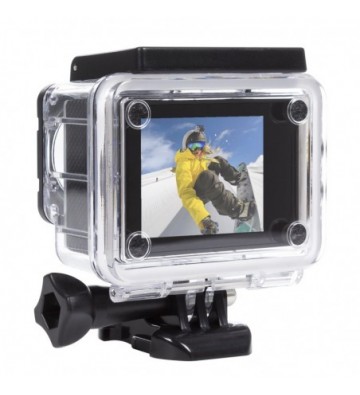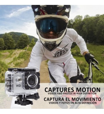 Cámara deportiva con óptica gran ángular: • Pantalla LCD de 2 pulgadas, podrás ver en directo tus grabaciones y reproducir los clips de video y fotos grabados. • Grabación de video en calidad HD 1080P. • Fotografias de 12 megapíxeles. • Carcasa protectora estanca, sumergible hasta 30 metros. • Funciones: detección de movimiento y grabación contínua en ciclo. • Accesorios: carcasa estanca, soporte para carcasa estanca, soporte de clip para carcasa estanca, soporte para manillar bici/moto, clip multifunción, clip de cámara, soporte para casco, correas ajustables, cable USB, manual de instrucciones • Idiomas: español, italiano, inglés, francés, alemán, portugués, ruso, chino simplificado, chino tradicional, japonés Pantalla LCD de 2 pulgadas. Formatos de video:1080P 30fps, 720P 30fps, VGA 640x480 30fps. Píxeles de imagen: 12 mpx Capacidad de la batería: 900 mAh USB 2.0 Angulo del objetivo: 120º Soporta Tarjetas de memoria Micro SD hasta 32GB PVC Aleación_de_Metal