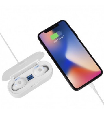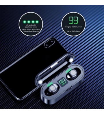 Auriculares TWS F9 Bluetooth 5.0 táctil con base de carga powerbank con indicador de carga interna y de auriculares.
