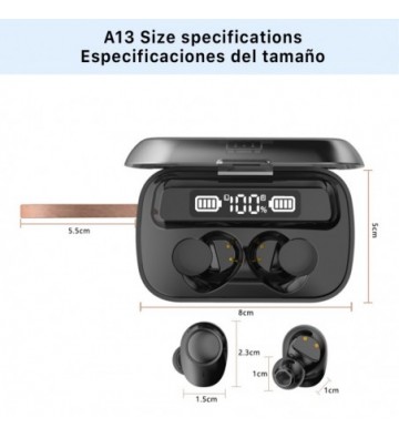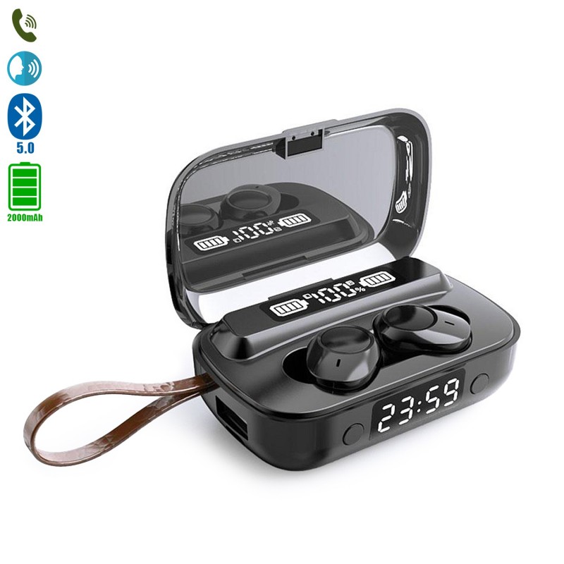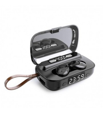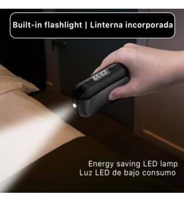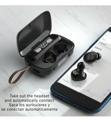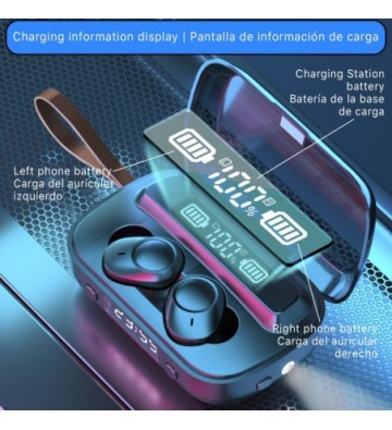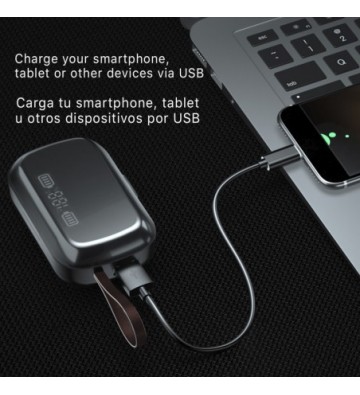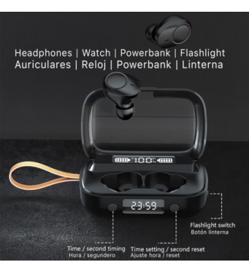 • Base de carga: display frontal con reloj digital. Salida USB para utilizar como powerbank / batería externa. Indicador del porcentaje de batería restante e indicadores led luminosos de carga de los auriculares. Incluye linterna led lateral y asa de cuero sintético.