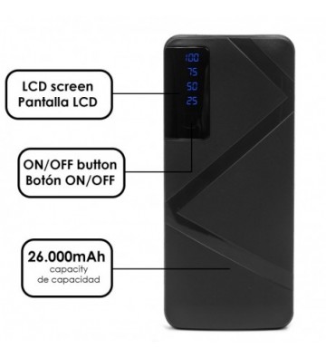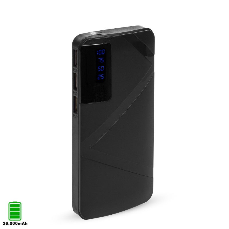 PowerBank de 26.000mAh. • Diseño rectangular con pantalla LCD indicadora del nivel de carga. • Linterna LED incorporada. • Protección contra calentamiento, cargas electromagnéticas externas e internas, sobrecarga de tensión, sobrecarga de aparatos conectados y cortocircuitos. • Triple salida USB de 1A. • Sin efecto memoria. • Conexión de entrada para su recarga, mediante micro USB. Capacidad: 26.000mAh 3 salidas USB: 5V/1A 1 entrada micro USB: DC 5V/2A Incluye cable de carga PVC Aleación_de_Metal