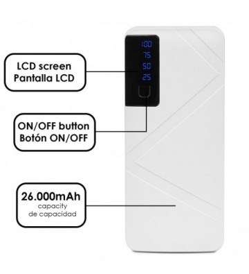 PowerBank de 26.000mAh. • Diseño rectangular con pantalla LCD indicadora del nivel de carga. • Linterna LED incorporada. • Protección contra calentamiento, cargas electromagnéticas externas e internas, sobrecarga de tensión, sobrecarga de aparatos conectados y cortocircuitos. • Triple salida USB de 1A. • Sin efecto memoria. • Conexión de entrada para su recarga, mediante micro USB. Capacidad: 26.000mAh 3 salidas USB: 5V/1A 1 entrada micro USB: DC 5V/2A Incluye cable de carga PVC Aleación_de_Metal