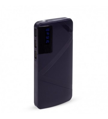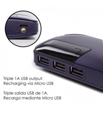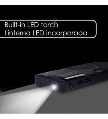 PowerBank de 26.000mAh. • Diseño rectangular con pantalla LCD indicadora del nivel de carga. • Linterna LED incorporada. • Protección contra calentamiento, cargas electromagnéticas externas e internas, sobrecarga de tensión, sobrecarga de aparatos conectados y cortocircuitos. • Triple salida USB de 1A. • Sin efecto memoria. • Conexión de entrada para su recarga, mediante micro USB. Capacidad: 26.000mAh 3 salidas USB: 5V/1A 1 entrada micro USB: DC 5V/2A Incluye cable de carga PVC Aleación_de_Metal