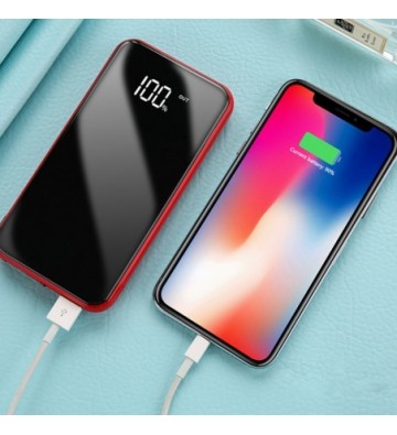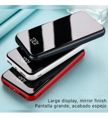 PowerBank de 20.000mAh. • Diseño rectangular con acabado espejo y pantalla LCD indicadora del nivel de carga. • Linterna LED incorporada. • Protección contra calentamiento, cargas electromagnéticas externas e internas, sobrecarga de tensión, sobrecarga de aparatos conectados y cortocircuitos. • Doble salida USB de 2A. • Sin efecto memoria. • Conexión de entrada para su recarga, mediante micro USB. Capacidad: 20.000mAh 2 salidas USB: 5V/2A 1 entrada micro USB: DC 5V/2A PVC Aleación_de_Metal