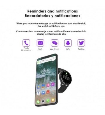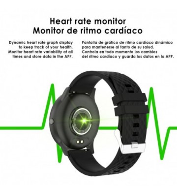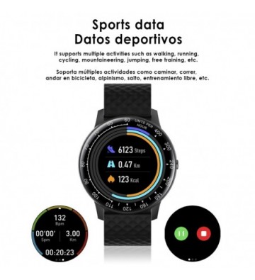 Smartwatch H30 multifunción. Funciones: • Sincronización y aviso de notificaciones del teléfono, como email, Whatsapp, Facebook, Twitter, etc y SMS. Compatible con dispositivos Android e iOS mediante aplicación gratuita • Aviso de llamadas. • Control remoto de la cámara del Smartphone. • Dial totalmente personalizable: podrás poner tus propias fotos como fondo de pantalla. • Información del tiempo, mediante app. • Alarma. • Compatible con pulseras intercambiables de sistema Quick Release, de 22mm de anchura. • Idiomas reloj: inglés y chino. • Idiomas APP: español, italiano, inglés, árabe, danés, alemán, finlandés, francés, japonés, coreano, holandés, noruego, polaco, portugués, ruso, sueco, tailandés, ucraniano, chino, chino tradicional. Funciones de salud: • Monitor cardíaco, con registro de pulsaciones. • Medición de presión sanguínea. • Medición de oxígeno en sangre. • Podómetro con contador de pasos, tiempo de actividad, calorías quemadas, distancia recorrida. • Modo multideportivo: andar, correr, ciclismo, senderismo. • Recordatorio de actividad (aviso de sedentarismo) con alarma. • Monitor de sueño, con indicador de tiempo y calidad del mismo. Incluye cable de carga USB magnético. Chip: Realtek 8762C Sensor: Silan SC730 Pantalla: táctil, IPS 1.28 pulgadas Resolución: 240x240 IP67, resistente a salpicaduras y agua en uso diario, no sumergir. Batería: 200 mAh Duración: hasta 5 días en uso, hasta 30 días en reposo Tiempo de carga aproximado: 2 horas Bluetooth: 4.0 Compatibilidad: iOS 9.0 y Android 4.4 o superior. PVC Aleación_de_Metal