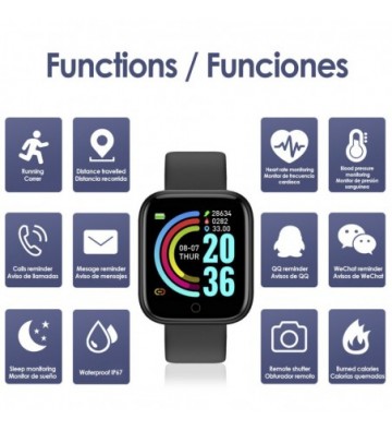 Brazalete inteligente AK-Y68 con monitor cardiaco y presión sanguínea. Funciones: • Aviso de notificaciones de aplicaciones tipo Whatsapp, Facebook, Wechat, etc. y mensajes SMS; con muestra de mensajes. • Avisos de llamadas entrantes. • Control remoto de la cámara del smartphone. • Encendido de pantalla al levantar la muñeca. • Idiomas soportados APP: español, italiano, chino, inglés, francés, portugués, holandés, alemán, ruso. Funciones de salud: • Monitor cardíaco, monitor de presión sanguínea. • Podómetro con medición de pasos, estimación de calorías, distancia recorrida. • Modo multi deportivo: correr, flexiones y saltos a la comba. • Aviso de sedentarismo. • Monitor de sueño con medición de tiempo y calidad. Pantalla: 1.3 pulgadas IPS, 240x240 píxeles de resolución Bluetooth: 4.0 Batería: 100mAh Sellado: IP67 Memoria: 16KB + 128KB Cargador incorporado en el cuerpo del reloj. Adaptador de corriente no incluido. PVC y aleación de metal
