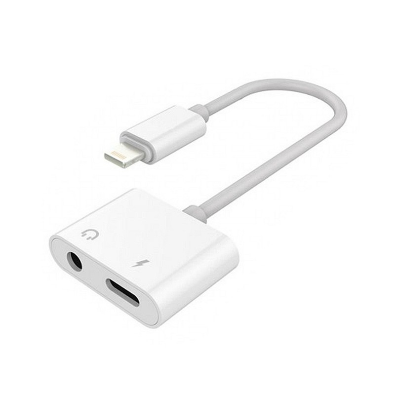Adaptador Lightning macho a minijack 3,5mm y Lightning. Permite cargar y escuchar música simultáneamente.