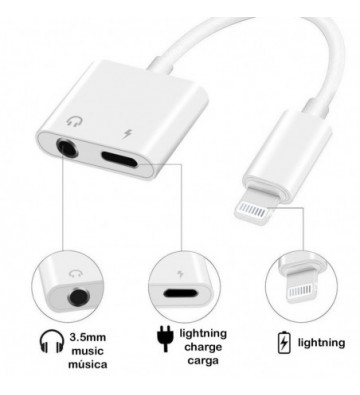 Adaptador Lightning macho a minijack 3 5mm y Lightning. Permite cargar y escuchar música simultáneamente.