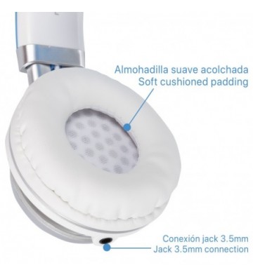 Cascos con conexión Jack 3.5mm: • Diseño cómodo gracias a su diadema acolchada. • Plegables. Longitud de diadema ajustable. • Cable doble Jack 3.5mm con micrófono incorporado. • Refuerzo de graves. Auriculares: Respuesta en frecuencia: 20-20. 000 Hz. Impedancia: 32 Ohm. Sensibilidad: 104 dB. Minijack 3,5 mm. Micrófono: Respuesta en frecuencia: 75-16. 000Hz. Sensibilidad: -42dB-2dB. Impedancia: <2.2K PVC Aleación_de_Metal