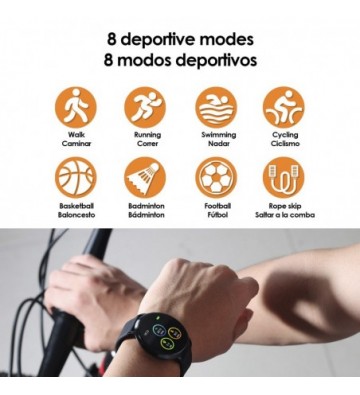 • Modo multideporte, con medición de pasos, calorías, pulsaciones, etc. Incluye modos: andar, correr, ciclismo, natación, baloncesto, bádminton, natación, fútbol.