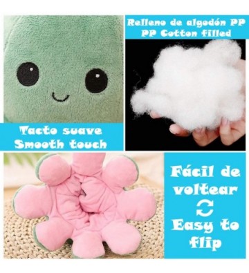 • Pulpo reversible de peluche, blandito y suave, con 2 caras, le proporciona diferentes experiencias visuales y sensoriales. • Este peluche de diseño único se puede voltear fácilmente, cambiando el color y su expresión facial de contento a enfadado o triste. • Facilita la comunicación de las emociones en los pequeños que padecen de autismo, síndrome de asperger o TDAH. También es útil para los niños que sufren trastornos del lenguaje. • El producto es seguro para los más pequeños de la casa (recomendamos utilizar bajo supervisión de un adulto), está hecho de material de felpa duradero y está relleno con material de algodón PP de alta calidad. • Fácil de limpiar, use una pequeña cantidad de jabón y agua para eliminar las manchas y secar de forma natural. Fabricado en 100% poliéster. Siempre recomendamos utilizarlo bajo la supervisión de un adulto. No recomendado para menores de 3 años. Lavar a mano, máximo 40°C. No planchar. Mantener alejado de fuentes de calor y del fuego. Los colores pueden sufrir ligeras variaciones. La posición de la cara (Contento / enfadado) en referencia al color, puede variar. Poliéster