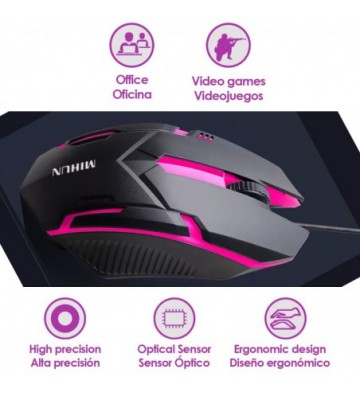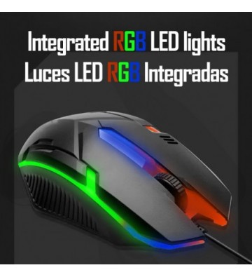 Ratón especial gaming con iluminación LED: • 1000 dpi. • Iluminación RGB. • Diseño ergonómico para largas sesiones de uso. Simétrico. • Sensor de seguimiento LED óptico. Interfaz: USB Modo luminoso: RGB Longitud del cable aproximado: 150cm Voltaje: DC 5V / <50mA Número de botones: 3 ABS y aleación de metal