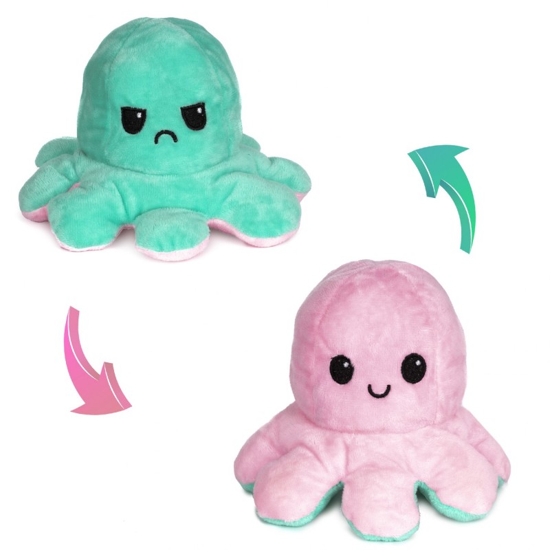 • Este peluche de diseño único se puede voltear fácilmente, cambiando el color y su expresión facial de contento a enfadado o triste.