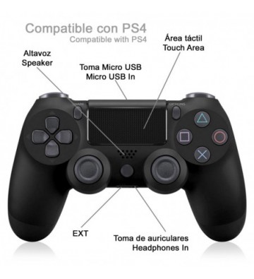 • Compatible con PS4. • Función de vibración. • Área táctil. • Conexión aux. y de auriculares. • Altavoz incorporado. • Incluye cable de carga USB a micro USB de 0.8m. Entrada: 5V - 800mA Batería: recargable de iones de litio Capacidad: 400mAh Temperatura de funcionamiento: 5 – 35°C ABS y aleación de metal.