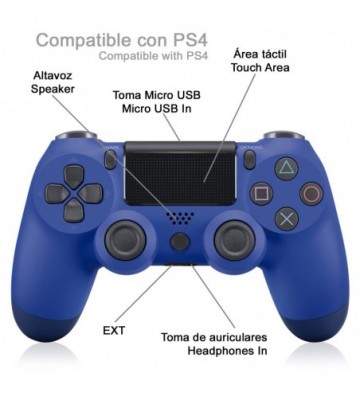 • Compatible con PS4. • Función de vibración. • Área táctil. • Conexión aux. y de auriculares. • Altavoz incorporado. • Incluye cable de carga USB a micro USB de 0.8m. Entrada: 5V - 800mA Batería: recargable de iones de litio Capacidad: 400mAh Temperatura de funcionamiento: 5 – 35°C ABS y aleación de metal.
