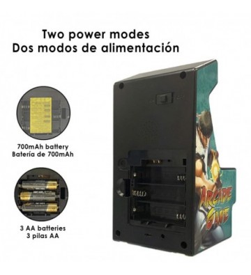 Consola Arcade máquina recreativa mini: • Incluye 156 juegos preinstalados clásicos de 16 bits. • Diseño de máquina recreativa clásica en miniatura. Con joystick y botones totalmente funcionales. • Pantalla de 2,8 pulgadas LCD. Altavoz incorporado, con control de volumen. • Batería incorporada de 700mAh. • Salida minijack para conectar unos auriculares o altavoces. • Cable de conexión VGA a TV. Podrás jugar en tu televisión, controlándola desde los mandos del propio dispositivo. • Incluye cable de carga USB a micro USB. Entrada: DC 5V Batería: 700mA PVC y aleación de metal.