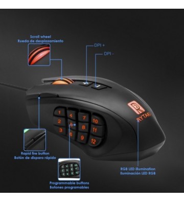 • Diseño ergonómico para largas sesiones de uso. 19 botones, programables mediante software.