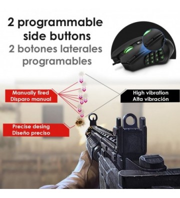 • Botón de disparo dedicado. Ajustes de velocidad de puntero, doble click, rueda de desplazamiento, sensibilidad y tasa de sondeo (125, 250, 500 y 1000Hz).