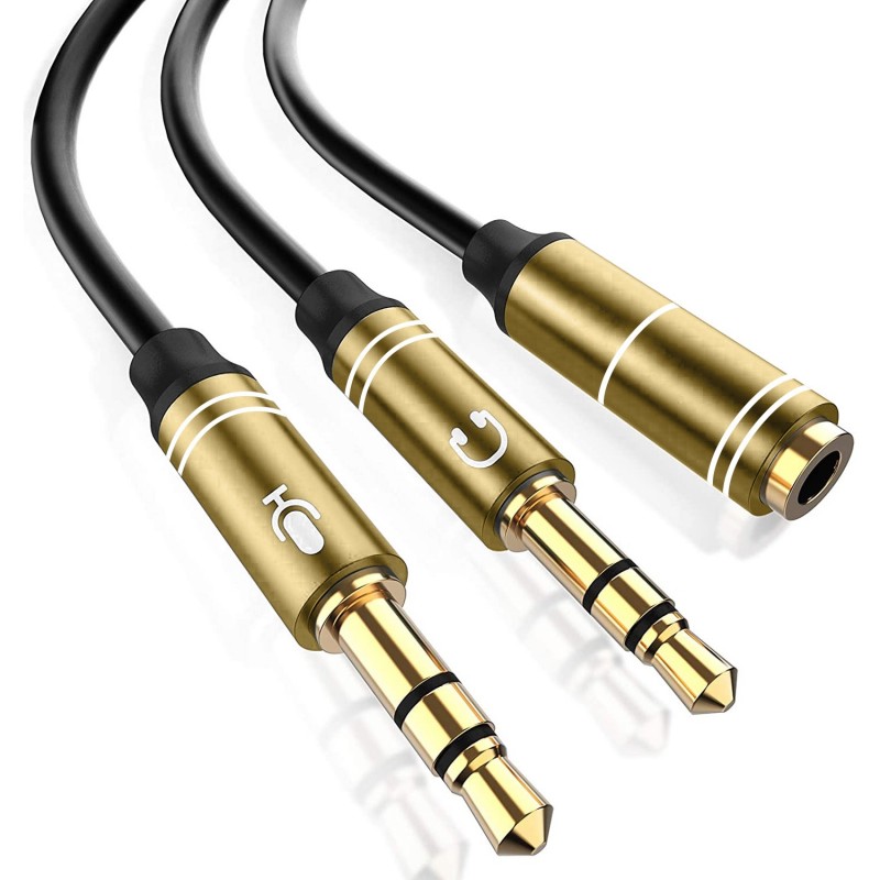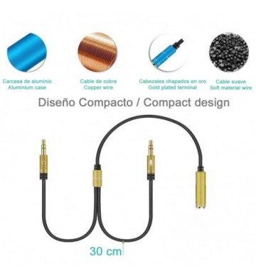 Splitter conversor de audio: • De doble minijack macho, con conexión de micrófono y altavoz, a minijack hembra. • Permite utilizar auriculares y dispositivos de sonido con minijack simple y micrófono, en PCs y dispositivos con entrada de altavoces y micrófono separadas. • Terminales acabados en metal. PVC y aleación de metal.