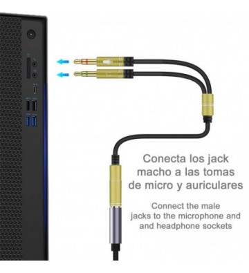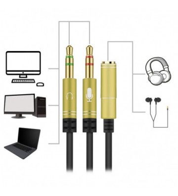 Splitter conversor de minijack (hembra) a doble minijack macho (micrófono y altavoz). Utiliza auriculares con micro incorporado y minijack simple en tu PC.