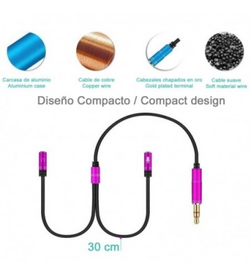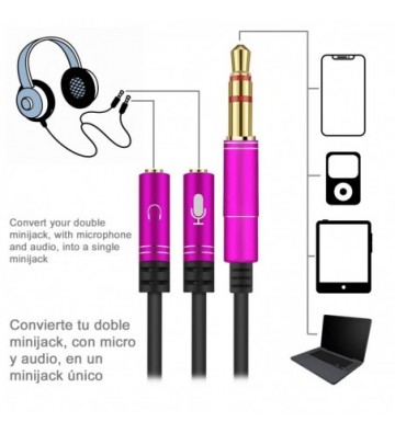 Splitter conversor de doble minijack hembra (micrófono y altavoz) a minijack macho. Utiliza auriculares de PC con micro en tu smartphone y tablet.