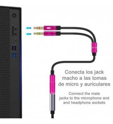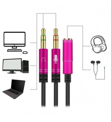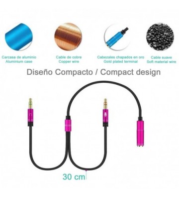 Splitter conversor de minijack (hembra) a doble minijack macho (micrófono y altavoz). Utiliza auriculares con micro incorporado y minijack simple en tu PC.