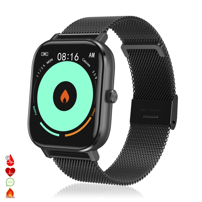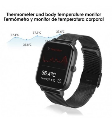 Smartwatch DT35+ con pulsera de acero, termómetro, monitor de tensión y oxígeno en sangre. Notificaciones en pantalla iOS y Android.