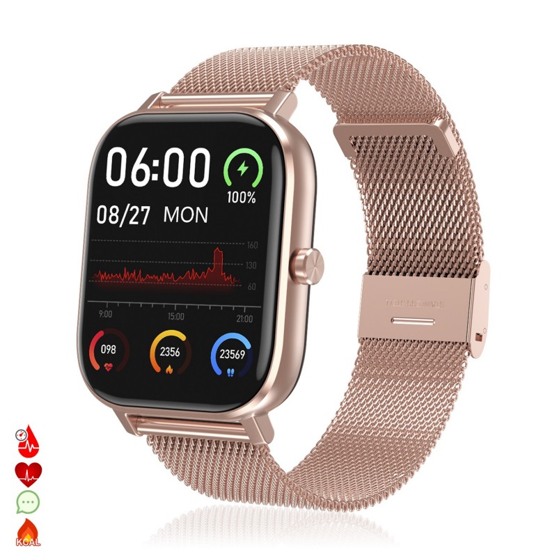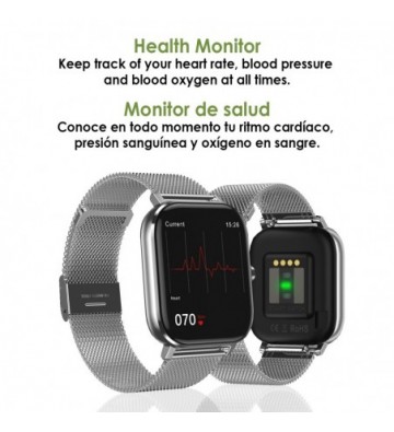 Smartwatch DT35+ con pulsera de acero, termómetro, monitor de tensión y oxígeno en sangre. Notificaciones en pantalla iOS y Android.