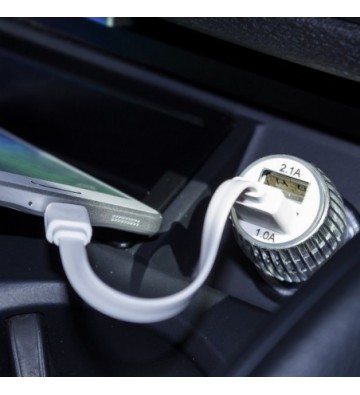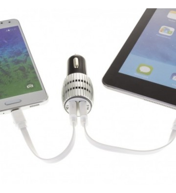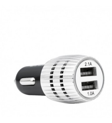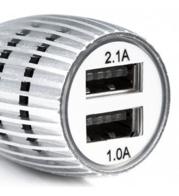 Cargador rápido para coche, con dos salidas USB de 1 y 2.1 amperios. Diseño con carcasa metálica y orificios de ventilación para evitar el sobrecalentamiento. Protección contra sobrecarga. Voltaje de entrada: 12-24V y de 50 a 60 Hz. Voltaje de salida: 5.0V 1A. PVC Aleación_de_Metal