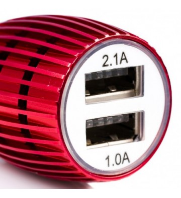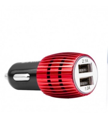 Cargador rápido para coche, con dos salidas USB de 1 y 2.1 amperios. Diseño con carcasa metálica y orificios de ventilación para evitar el sobrecalentamiento. Protección contra sobrecarga. Voltaje de entrada: 12-24V y de 50 a 60 Hz. Voltaje de salida: 5.0V 1A. PVC Aleación_de_Metal