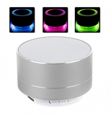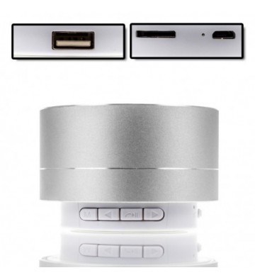 Altavoz inalámbrico con acabado metalizado e iluminación LED a todo color. Reproduce música a través de USB, tarjeta microSD, Bluetooth o radio FM. Gracias al micrófono integrado podrás contestar llamadas desde él. Tiempo de funcionamiento: hasta 2 horas. Potencia: 3W. Frecuencias: 280Hz - 18kHZ. Sensibilidad: ?95dB. Distorsión: <5%. Voltaje de carga: 5V ± 0,3. Capacidad de la batería: 400 mAh. Distancia de funcionamiento: hasta 10 metros. PVC Aleación_de_Metal