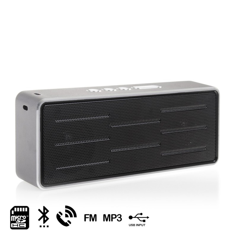 Altavoz diseño recto con reproductor MP3, Bluetooth, radio FM y manos libres . Luz de carga. Lector de tarjeta Micro SD. Entrada USB. Contiene cable USB-Micro USB. Potencia altavoz: 3 W. Distancia de transmisión: 10 m. Capacidad de batería: 600mAh. Autonomía: hasta 2,5 horas. PVC Aleación_de_Metal