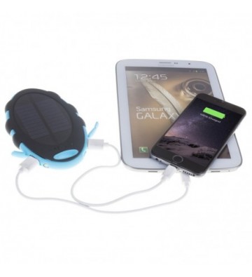 Powerbank con panel solar fotosensible para su carga. Batería de 5000mAh recargable también mediante la corriente eléctrica. Leds indicadores de nivel de carga en el frontal. Resistente a salpicaduras, polvo e impactos por caída. Incorpora linterna LED para emergencias perfecta para viajar y transportar mediante un mosquetón. Dispone de dos salidas USB ocultas de 5V-1A para conectar dos dispositivos a la vez. Contiene cable USB-Micro USB de 28 cm. Capacidad de la batería: 5000mAh Micro-USB entrada: DC 5V-1A. USB salida 1 y 2: DC 5V-1A. Panel solar de silicio monocristalino de 1.2 W. PVC Aleación_de_Metal