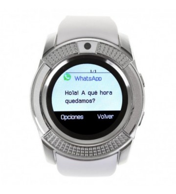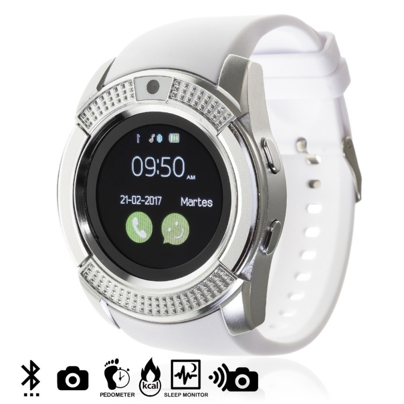Smartwatch bluetooth con pantalla táctil circular de 1.22 pulgadas IPS, con 180º de ángulo de visión y 240x240 px de resolución. Con opción a tarjeta micro SIM (para utilizar como un teléfono independiente) y tarjeta de memoria micro SD. Cámara incorporada de 0,3 mpx.
