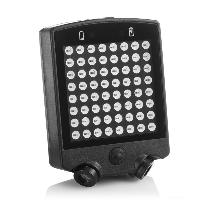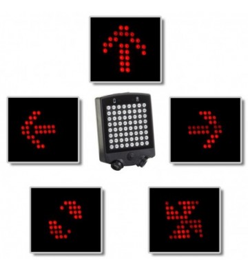 Señalización para bicicletas con control remoto. Dispone de un panel con 64 luces LED rojas y otras dos luces rojas en la parte inferior. Mediante el control remoto podrá señalizar su dirección con una flecha izquierda y una flecha derecha. También podrá realizar otras señalizaciones como flecha frontal, cuadrados, etc. Las luces inferiores disponen de tres posiciones: apagadas, intermitentes y fijas. Señalización: Batería de 650mAH. Control remoto: pila CR2032. PVC Aleación_de_Metal