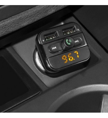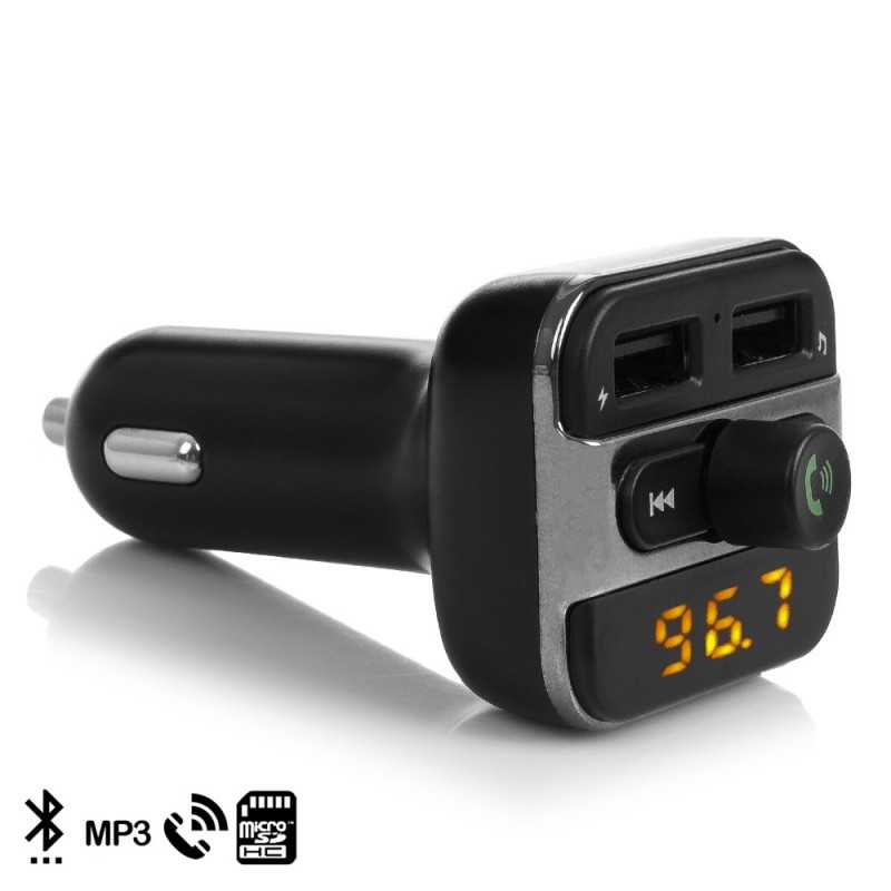 Transmisor FM con manos libres Bluetooth. Gracias al transmisor FM, podrás escuchar por los altavoces de tu vehículo: - Reproductor de música vía Bluetooth. - Reproductor MP3 mediante tarjeta MicroSD y pendrive USB. - Manos libres inalámbrico, con opciones de: responder llamada, colgar, rechazar llamada y rellamada. Display digital. Doble salida de carga USB, una de 2.4A y otra de 1A. Bluetooth: AC4601 V2.1 Rango de frecuencias: 87.5-108.0MHz Voltaje de salida: 5V/2.1A en total. Formatos compatibles de reproducción de música: mp3, wma. Distancia de transmisión: 10 metros (aproximadamente). Capacidad máxima USB/MicroSD: 32GB. PVC Aleación_de_Metal