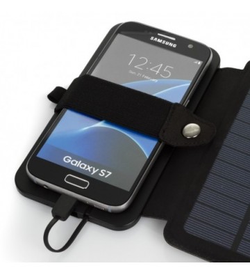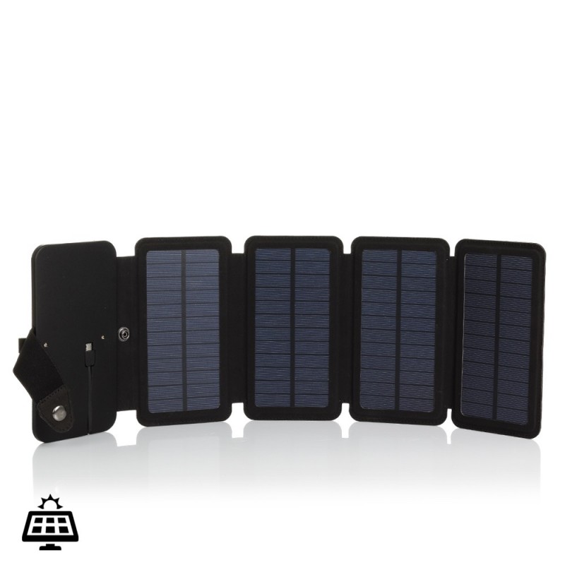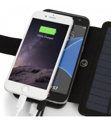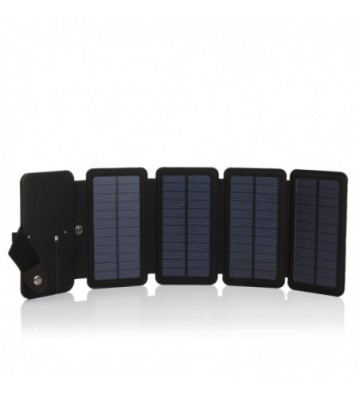 Panel solar con cuádruple panel fotoreceptor, para cargar tus dispositivos gracias a su conexión USB. Especialmente diseñado para cargar tu teléfono smartphone, y otros dispositivos electrónicos compatibles con carga USB. Podrás cargar hasta dos dispositivos simultaneamente ya que dispone de un cable MicroUSB incorporado en el panel y de una salida USB adicional. Dispone de una tira con botón para cerrar el panel y transportarlo cómodamente. También podrás utilizarlo para sujetar un teléfono al panel. Incluye cable de carga MicroUSB a USB y un mosquetón con brújula. PVC Aleación_de_Metal