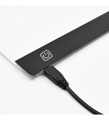 Mesa de dibujo LED tamaño A4. • Retro iluminación LED con 3 intensidades. • Perfecta para largas sesiones de trabajo: sin sombras al dibujar, iluminación continua sin parpadeos y sin radiaciones. • Perfecta para aprender a trazar, realizar calcos, animación 2D, etc. • Bajo consumo de energía. • Incluye cable USB de conexión. Voltaje de entrada USB: DC 5V Voltaje de entrada del adaptador: 100V ~ 240V (no incluído) Longitud del cable: 145cm PVC Aleación_de_Metal